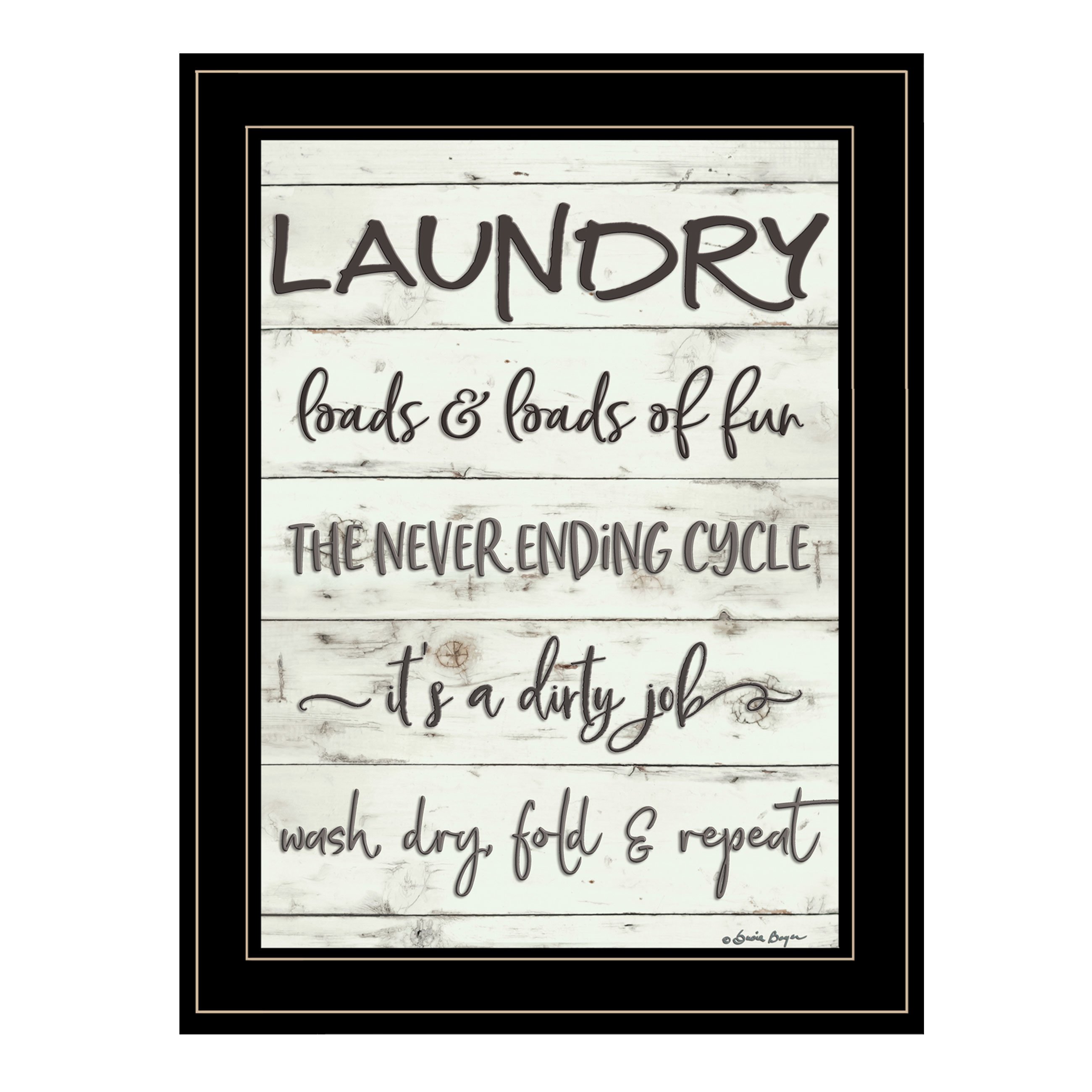 BOY418-704G "Laundry" by Susie Boyer. This black frame 15x19 print would go great in a laundry room with the script saying "Laundry Loads & Loads of fun, The Never Ending cycle, it's a Dirty Job, Wash, Dry, Fold, & repeat." The surface of the art is coated with a fade resistant texture which gives it a canvas-like appearance. No glass is necessary. Arrives ready to hang. •Women Owned (WBE)•Textured Artwork with a 'rolled on' acid free acrylic coating to create a canvas painting effect. No glass is necessary.•UV protectant coating protects artwork from fading.•Molding adds natural beauty to the framed art. Frame is keyholed for ease of hanging.•Frame is keyholed for ease of hanging.