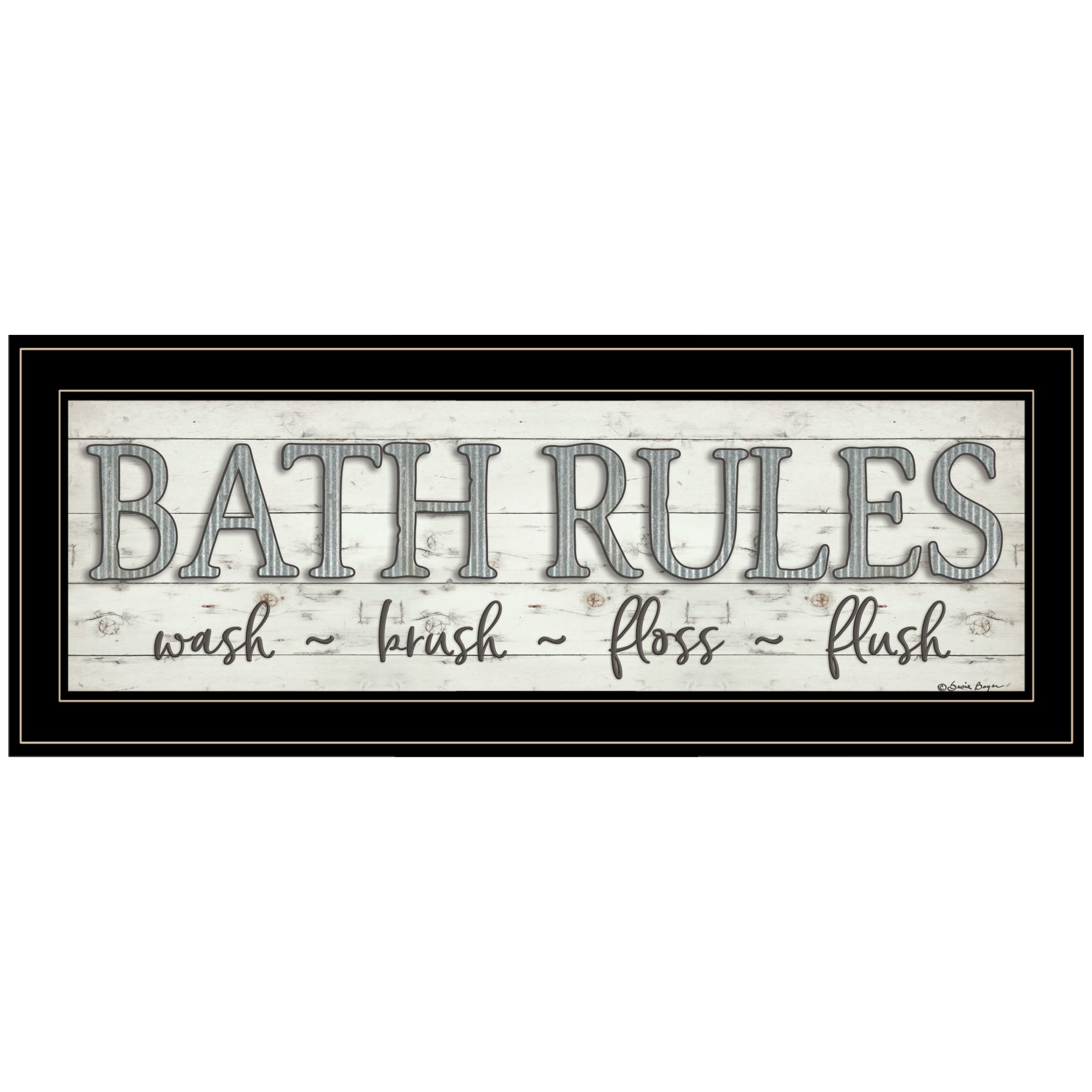 BOY448-704G "Bath Rules" By Susie Boyer. This black frame 21x8 print for the bathroom; Bath Rules. The surface of the art is coated with a fade resistant texture which gives it a canvas-like appearance. No glass is necessary. Arrives ready to hang.•Women Owned (WBE)•Textured Artwork with a 'rolled on' acid free acrylic coating to create a canvas painting effect. No glass is necessary.•UV protectant coating protects artwork from fading.•Molding adds natural beauty to the framed art. Frame is keyholed for ease of hanging.•Frame is keyholed for ease of hanging.