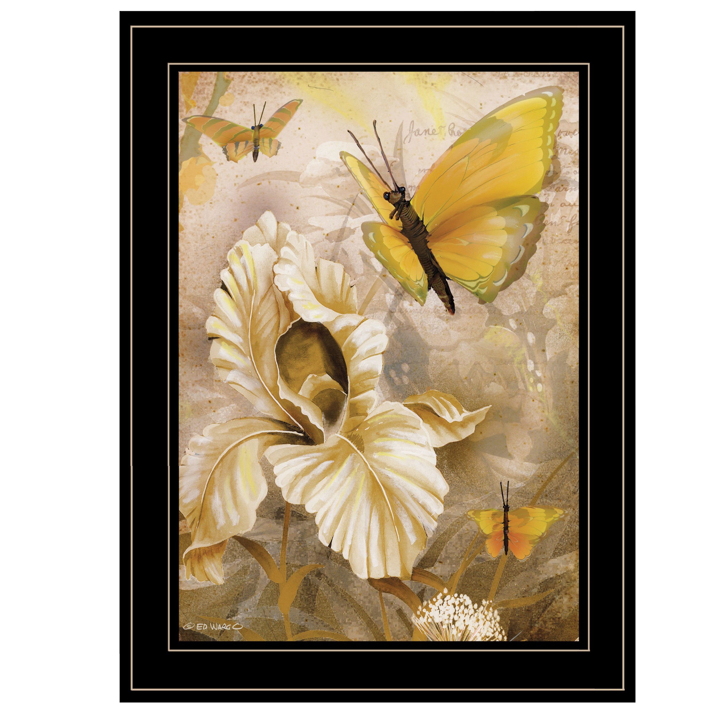 ED417-704G "Flowers & Butterflies I" by artisan Ed Wargo. This decorative black (19x15) framed flowers & butterflies; all of yellow tones. Framed print has a UV coating (glass is not needed) and arrives ready to hang. Made in USA•Women Owned (WBE)•Textured Artwork with a 'rolled on' acid free acrylic coating to create a canvas painting effect. No glass is necessary.•UV protectant coating protects artwork from fading.•Molding adds natural beauty to the framed art. Frame is keyholed for ease of hanging.•Frame is keyholed for ease of hanging.