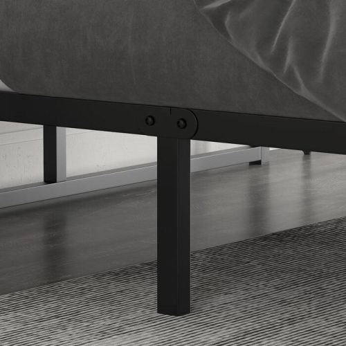 This Minimalist Storage Metal Platform Bed Black brings a sleek modern look to your bedroom. Made from metal with a black finish, it has an airy, open-frame design that leaves 14" of under-bed space for shoes or storage boxes. This platform bed has pre-drilled holes, so you have the option to attach a headboard. The included slats are held in place with hook and loop fasteners and support the mattress of your choice. No box spring is required; a mattress and headboard are sold separately.