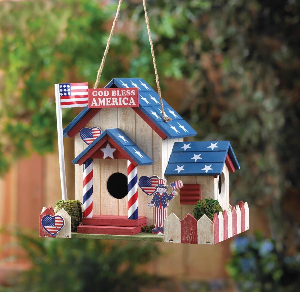 • Uncle Sam is ready to welcome some feathered friends to your yard! This darling birdhouse is filled with patriotic charm, featuring an American flag flying high from the flag pole, stars on the roof, and a red and white picket fence. Two entrances and heart-shaped decorations will make your birds feel right at home in the U.S.A!