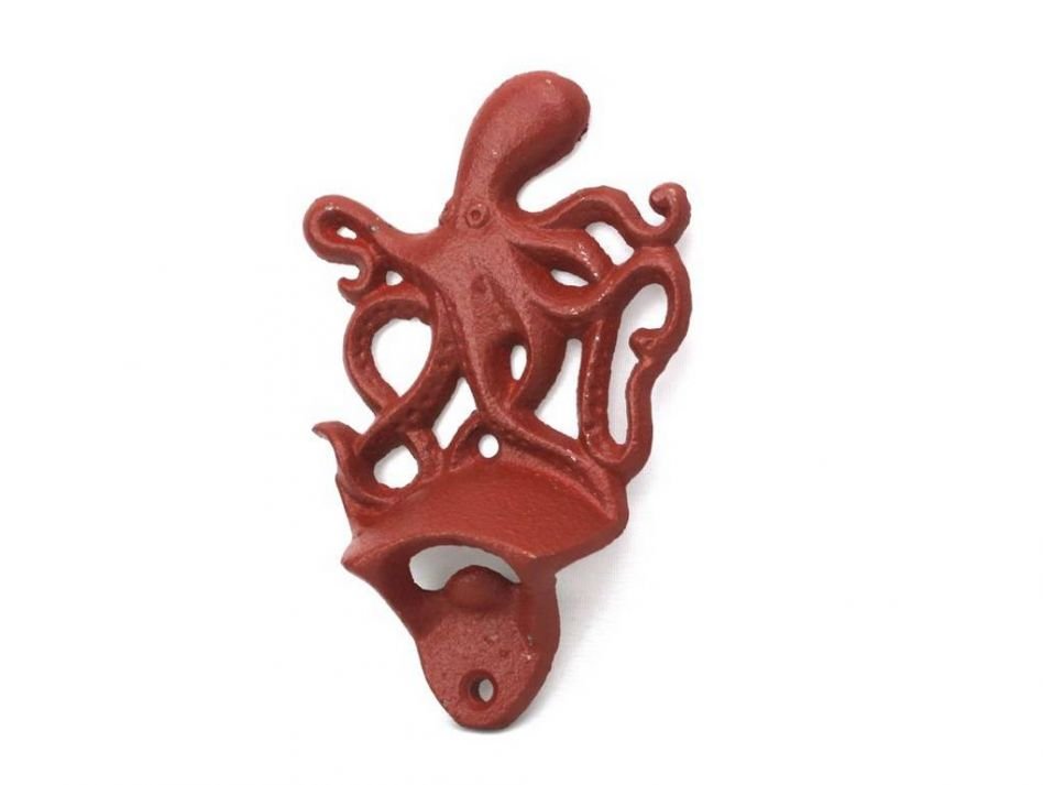 The Rustic Red Cast Iron Wall Mounted Octopus Bottle Opener 6" perfectly accents any nautical themed kitchen or bar. Crafted from cast iron rustic finish, this heavy bottle opener will open even the most difficult of bottles with ease.