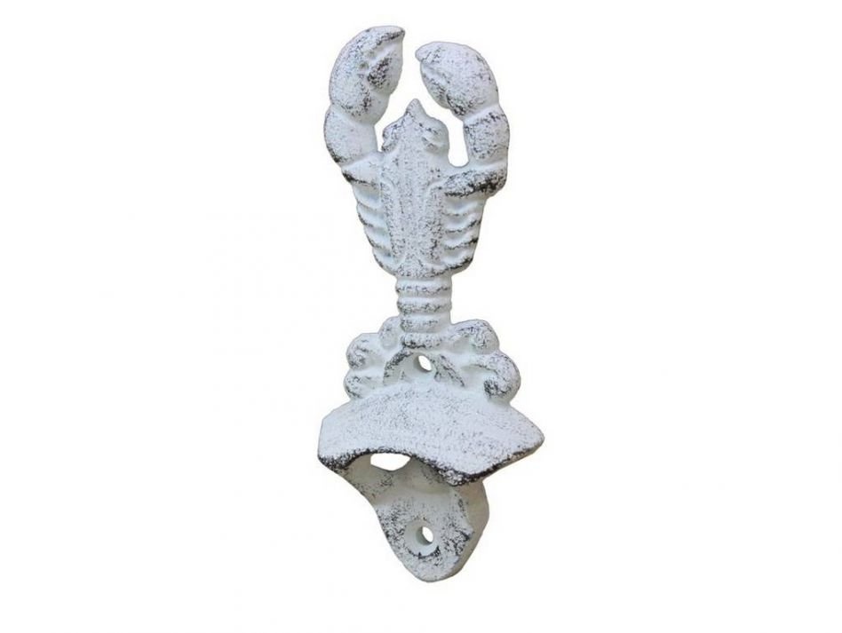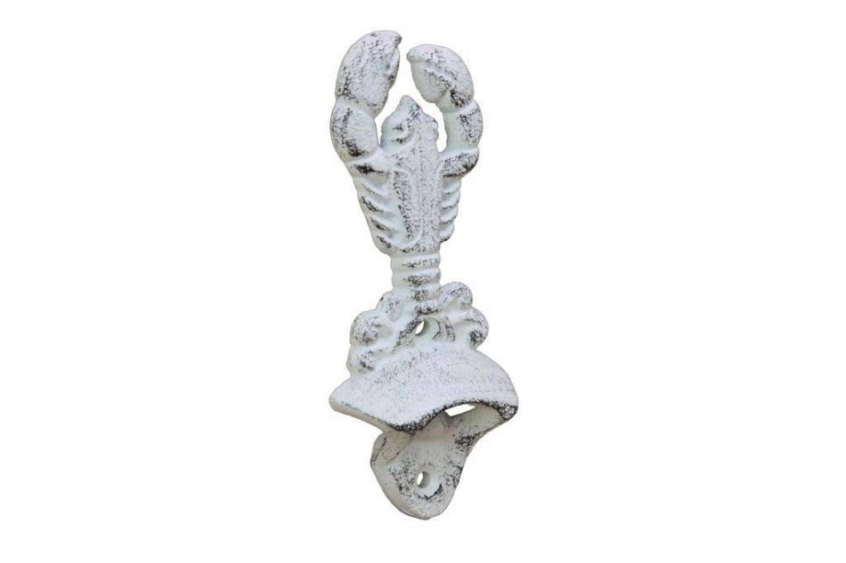 The Whitewashed Cast Iron Wall Mounted Lobster Bottle Opener 6" perfectly accents any nautical themed kitchen or bar. Crafted from cast iron rustic finish, this heavy bottle opener will open even the most difficult of bottles with ease.