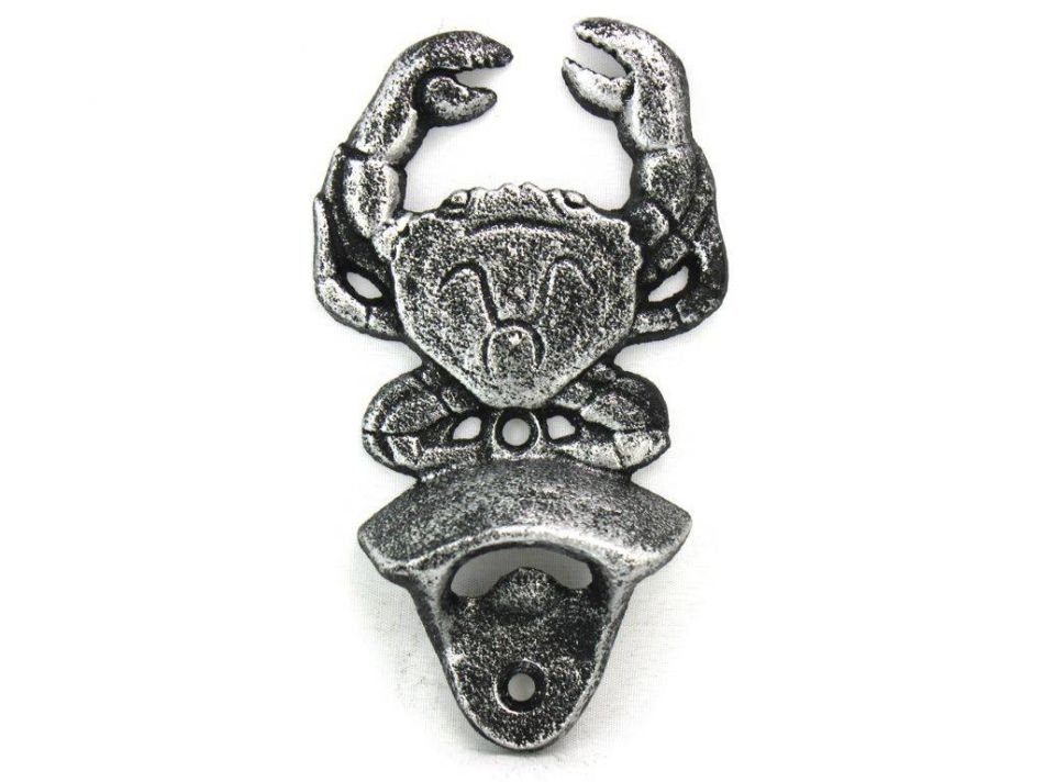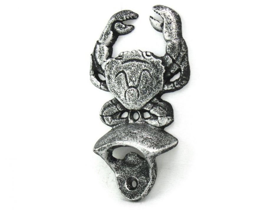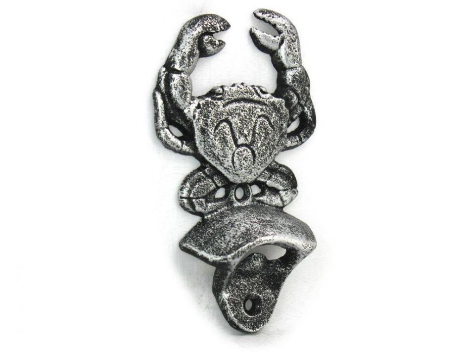 The Antique Silver Cast Iron Wall Mounted Crab Bottle Opener 6" perfectly accents any nautical themed kitchen or bar. Crafted from cast iron rustic finish, this heavy bottle opener will open even the most difficult of bottles with ease.
