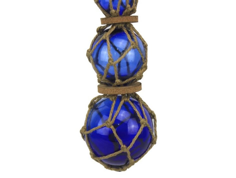 A glowing recreation of a nautical and fishing classic, these Triple Blue Japanese Glass Ball Fishing Floats with Brown Netting 11" are the perfect piece of nautical wall art whether in your home or office.  Enjoy the charming inner warmth as lights play through the glass bubble, perfectly contrasted with the authentic fishing rope holding it in place. Mesmerizing and enchanting, enjoy the historic wonder and brilliant style of this Japanese glass bass fishing float each and every day.