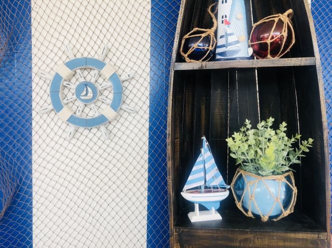 • White sailboat decoration in center of wheel perfectly accents the rustic blue finish