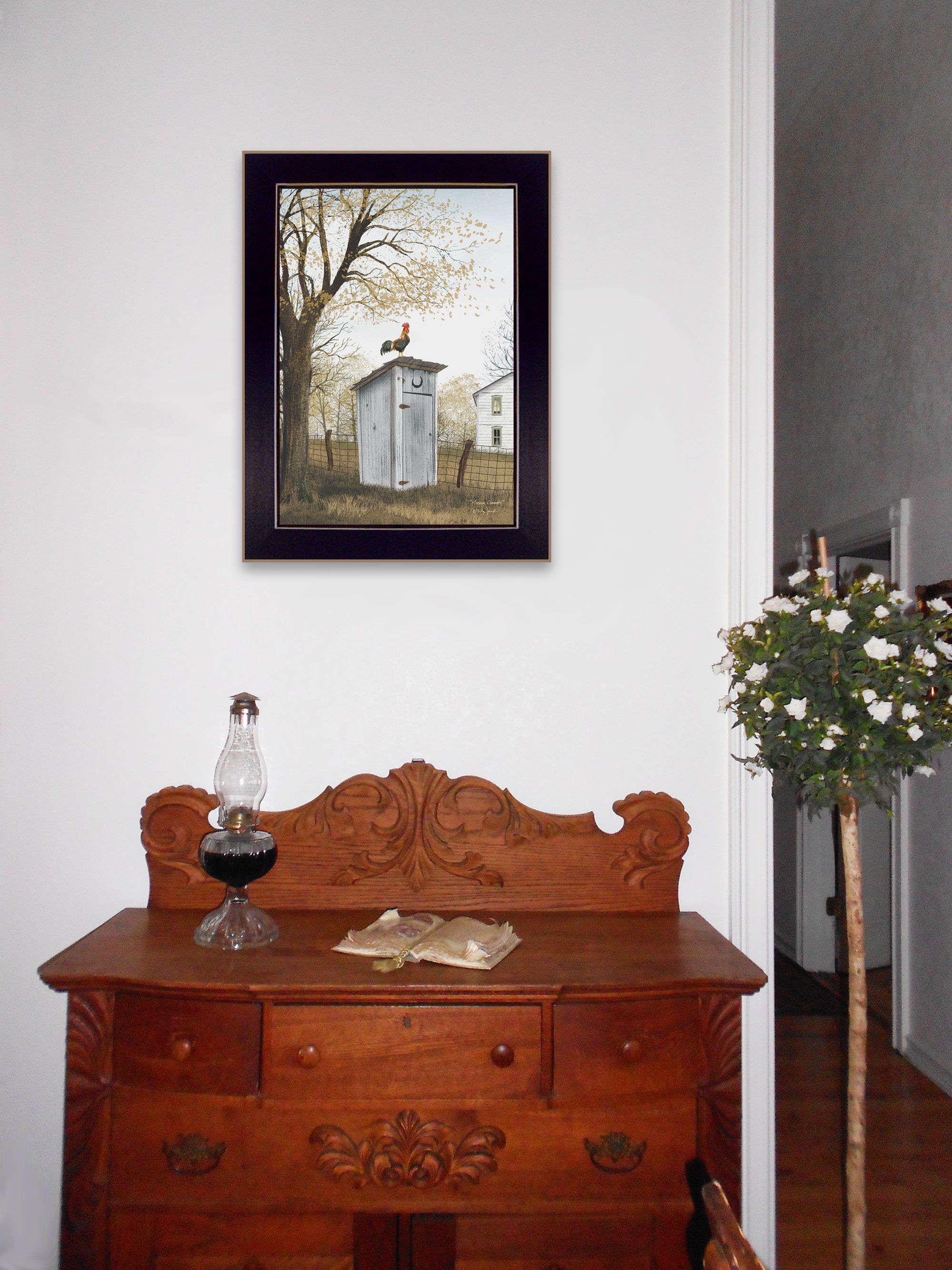 "Morning Commute(Outhouse)" by Billy Jacobs. This black framed print (14 x 18) of a country outhouse setting . The rooster sits on top of an outhouse, and you can see the country farmhouse in the background. Crafted By Skilled American Crafters And Coated With A Fade-resistant Texture, This Piece Has A Canvas-like Appearance That Will Last For Years To Come. Invest In A Piece That Is Truly One-of-a-kind.•Transform your walls with this stunning piece of art and bring a touch of modern elegance to your room. This stunning piece will not only add visual interest to any room but it's minimalist design will bring a sense of serenity to your space.•Tired of dull, empty walls in your home? We believe that walls should inspire, not bore. That's why we offer a wide range of wall art to suit any space from bedroom and kitchens to office and beyond. Give your walls a facelift with our printed arts and transform your space into a stylish and inviting home.•This framed wall art is hand-crafted in the USA of high-quality wood with the surface of the art coated with a fade-resistant texture which gives it a canvas-like appearance for many years of enjoyment in your home.•Bring a pop of colour and style to any room with our fully assembled and ready-to-hang wall art. With a wide selection of decorative pieces to choose from, you'll easily find the perfect match for your personal taste or to give as a thoughtful gift. Don't miss out on the opportunity to add some unique charm to your space.•Experience the unmatched quality and durability of American-made craftsmanship with this individually hand-crafted wall decoration art. Skilled crafters put their expertise into every piece to ensure it will stand test of time and bless your eyes for years to come.
