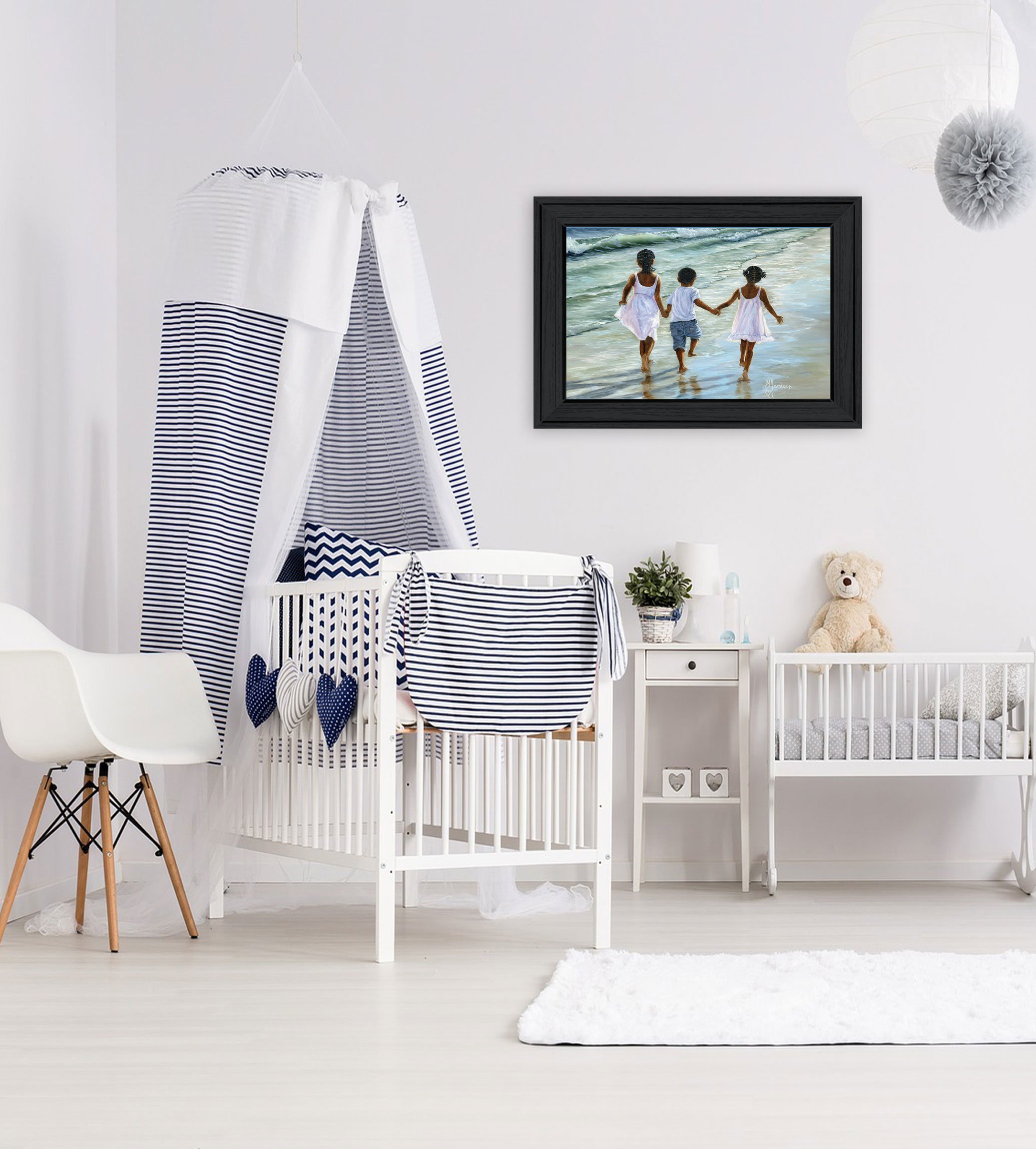 "Running on the Beach" is a 11"x15" black framed wall art by artist Georgia Janisse. This artwork features three children running on the ocean shoreline. Crafted By Skilled American Crafters And Coated With A Fade-resistant Texture, This Piece Has A Canvas-like Appearance That Will Last For Years To Come. Invest In A Piece That Is Truly One-of-a-kind.•Transform your walls with this stunning piece of art and bring a touch of modern elegance to your room. This stunning piece will not only add visual interest to any room but it's minimalist design will bring a sense of serenity to your space.•Tired of dull, empty walls in your home? We believe that walls should inspire, not bore. That's why we offer a wide range of wall art to suit any space from bedroom and kitchens to office and beyond. Give your walls a facelift with our printed arts and transform your space into a stylish and inviting home.•This framed wall art is hand-crafted in the USA of high-quality wood with the surface of the art coated with a fade-resistant texture which gives it a canvas-like appearance for many years of enjoyment in your home.•Bring a pop of colour and style to any room with our fully assembled and ready-to-hang wall art. With a wide selection of decorative pieces to choose from, you'll easily find the perfect match for your personal taste or to give as a thoughtful gift. Don't miss out on the opportunity to add some unique charm to your space.•Experience the unmatched quality and durability of American-made craftsmanship with this individually hand-crafted wall decoration art. Skilled crafters put their expertise into every piece to ensure it will stand test of time and bless your eyes for years to come.